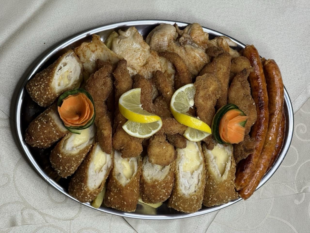 4 Karađorđeve šnicle, pileća korpica 15 komada, 2 pohovana sira i 500g pomfrit, Tartar sos, Urnebes sos i salata. 1kg mesa!